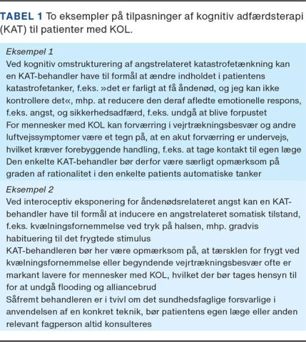 KAT-behandleren bør dog være varsom med at overføre generiske KAT-teknikker direkte til KOL-populationen. I Tabel 1 gives eksempler på tilpasninger af KAT til patienter med KOL.