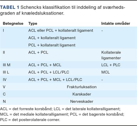 Som regel bruges Schencks klassifikation til inddeling af skaderne (Tabel 1) [5]. De hyppigste kombinationer ved FLS er ACL + MCL (19%), ACL + LCL + PLC (13%) og ACL + LCL (7%).
