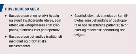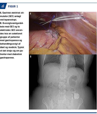 Gastrisk elektrisk stimulation (GES) er en relativt ny behandlingsform, der består af en pulsstimulator med to intramuskulære elektroder (Figur 1). Selve virkningsmekanismen ved GES er fortsat uklar. Strømstyrken er for svag til at stimulere kontraktioner af antrum eller aktivere en peristaltisk bølge [16]. En mulig virkningsmekanisme kunne være central modulering via en afferent impuls [24]. GES reducerer patienternes symptomer, men forbedrer ikke objektivt ventrikeltømningen [25]. Normalt er der ingen væsentlige komplikationer i forbindelse med operationen, og symptomlindringen kan vare ved i op til ti år [26].
