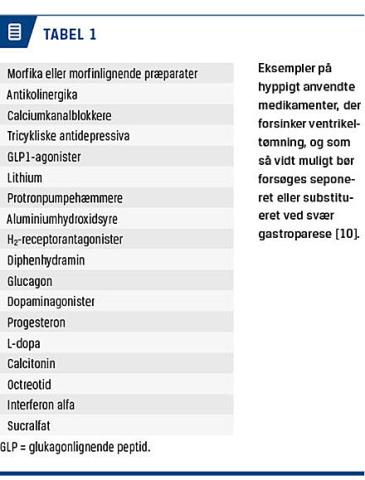 Initialt bør medicin med velkendt påvirkning af ventrikeltømningen så vidt muligt seponeres eller substitueres med anden medicin. I Tabel 1 ses eksempler på hyppigt anvendte lægemidler, der kan give forsinket ventrikeltømning.