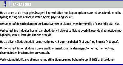 Patienter med hoste har en betydelig nedsat livskvalitet, hvorfor deres lidelse ikke må negligeres. Årsagen til hosten kan hos de fleste findes ved systematisk tilgang (Figur 1). Sufficient overblik dannes ved at inddele hoste i varighed, hvilket ligeledes giver værdifulde diagnostiske afgrænsninger. Det er vigtigt, at patienterne undersøges med henblik på at finde årsagerne til hosten, både for at afsløre eventuelt maligne tilstande og opspore sygdomme som KOL så tidligt i forløbet som muligt, så der kan initieres forebyggende tiltag, og endelig for at forbedre patienternes livskvalitet.