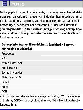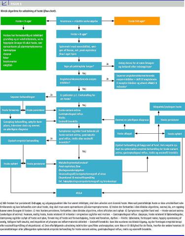 Ofte har man udelukket pulmonale årsager med normale fund ved henholdsvis spirometri og radiologi. Når rygning og irritation fra miljøet også er fraværende, skal man overveje astma, gastroøsofageal reflux (GORD), rinitis og eosinofil bronkitis (Tabel 2 ). Enten skal man vælge at fortsætte med den diagnostiske udredning eller påbegynde empirisk behandling på baggrund af anamnesen og den klinisk objektive undersøgelse (Figur 1).