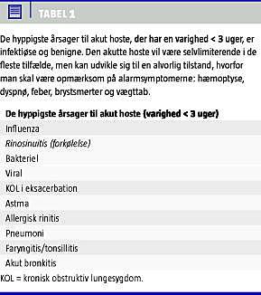 Den postinfektiøse hoste udgør størstedelen af årsagen til konsultationerne i almen praksis, særligt i vinterhalvåret [4]. De hyppigste infektioner, der udløser hoste, er lokaliseret til de øvre luftveje (Tabel 1 ): influenza og akut bakteriel eller viral rinosinuitis (forkølelse), men eksacerbation af kendt kronisk obstruktiv lungesygdom (KOL) eller astma, allergisk rinitis og pertussis (kighoste), som er mindre udtalt i Danmark på grund af et effektivt børnevaccinationsprogram, kan ligeledes være årsagen [12, 13]. Ved virale infektioner, hvor behandling undlades, er prævalensen af hoste på grund af influenza 83% i de første 48 timer og reduceres til 26% på 14.-dagen [15]. I de banale tilfælde, som afklares ud fra anamnesen og den klinisk objektive undersøgelse, bør konsultationerne munde ud i, at patienten gives indsigt i tilstandens benigne art, da hosten som regel er selvlimiterende (Figur 1). Man skal i sin udredning være særlig opmærksom på og udelukke symptomer som hæmoptyse, dyspnø, feber, brystsmerter og vægttab, der kan være tegn på en alvorlig lidelse, som kræver yderligere efterforskning i form af lungefunktionsundersøgelse (spirometri) og røntgen af thorax. Bronkoskopi er især indiceret ved hæmoptyse og mistanke om fremmedlegeme.
