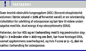 Osteoporose og frakturer forekommer hyppigere hos patienter med KOL end hos lungeraske [5]. Den relative risiko for, at der udvikles osteoporose, er 1,3-2,4 gange højere hos patienter med svær KOL (forceret eksspiratorisk volumen i første sekund (FEV1) < 50% af forventet værdi) end hos patienter med let KOL (FEV1 ≤ 80% af forventet værdi) [6]. Undersøgelser af prævalensen af osteoporose er dog afhængige af, hvordan den undersøgte KOL-population er rekrutteret; således er det tidligere fundet, at 27-67% af patienterne med KOL havde osteopeni, og 9-69% havde osteoporose [7]. I et dansk studie, hvor man undersøgte ambulante patienter med svær KOL, fandt man, at 45% havde osteoporose, og 22% havde osteopeni [8]. Vertebrale frakturer er hyppige hos patienter med KOL med en prævalens, der varierer fra 49% til 63%, og højere ved anvendelse af systemisk GK [9]. I et norsk studie fandtes prævalensen af vertebrale deformiteter at være 72% højere i en population af patienter med KOL end i en kontrolgruppe fra samme geografiske område [10]. I et mindre, retrospektivt studie af mandlige patienter med svær KOL fandtes ved gennemsyn af røntgenoptagelser af thorax, at vertebrale frakturer var underdiagnosticeret [11]. Det samme fandt man i et dansk studie, der primært omfattede kvinder [8]. Desuden er det påvist, at de fleste patienter med KOL og osteoporose ikke får behandling for osteoporose [12]. Vertebrale frakturer hos patienter med KOL mindsker thoraxvolumen, hvilket medfører hæmning af respirationen pga. smerter og evt. smertestillende medicin og dermed nedsat mulighed for fysisk aktivitet, hvilket igen leder til knogletab. Ifølge klinisk vejledning om KOL fra Dansk Selskab for Almen Medicin bør patienter med KOL have vurderet risikoen for udvikling af osteoporose ved den årlige kontrol af KOL. Fra 2011 blev behandling af patienter med svær KOL (FEV1 under 50% af forventet værdi) føjet til Lægemiddelstyrelsens liste over risikofaktorer for udvikling af osteoporotiske frakturer - dvs. accepteret som selvstændig risikofaktor. Disse patienter bør have målt knoglemineraltæthed (BMD) med dual energy X-ray absorptiometry (DXA) og sættes i relevant behandling. Intervallet mellem evt. DXA'er diskuteres nedenfor.