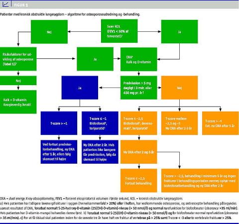 Vi har foreslået en algoritme for diagnostik, forebyggelse og behandling af osteoporose hos patienter med KOL. Svær KOL (FEV1 < 50% af forventet værdi) er en selvstændig risikofaktor for udvikling af osteoporose og disse patienter bør derfor vurderes med henblik på osteoporose. Behandles patienter med KOL med GK i dosering, der overstiger 5 mg dagligt i tre måneder eller 450 mg årligt, skal de have foretaget DXA uanset sværhedsgraden af KOL, og behandling for osteoporose bør påbegyndes allerede ved en T-score ≤ −1. Bisfosfonater er førstevalgspræparat, og ved svær osteoporose med vertebrale frakturer bør patienten vurderes med henblik på anabol behandling. Patienter, der har KOL med FEV1 ≥ 50% af forventet værdi og en eller flere andre risikofaktorer for udvikling af osteoporose, bør ligeledes undersøges med DXA.