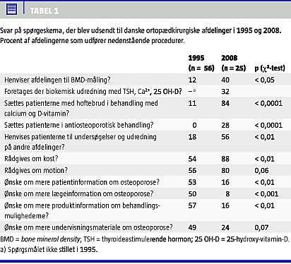 Resultater: I alt 56 (97%) ortopædkirurgiske afdelinger svarede på spørgeskemaet i 1995 og 25 (95%) i 2008. I 2008 henviste 40% (12% i 1995) patienter med hoftefrakturer til knogletæthedsmåling. 84% (11% i 1995) af afdelingerne satte patienterne med hoftebrud i behandling med kalk og D-vitamin. Medicinsk behandling indledtes i 2008 af 28% (0% i 1995) af afdelingerne. Over 80% (54% i 1995) af afdelingerne rådgav patienterne om vigtigheden af ændringer i deres livsstil. Halvdelen af afdelingernes læger ønskede i 1995 mere information om osteoporose mod kun 16% i 2008. I 2008 skrev 48% af afdelingerne til egen læge, at patienten med hoftebrud kunne have osteoporose og evt. burde videreudredes.