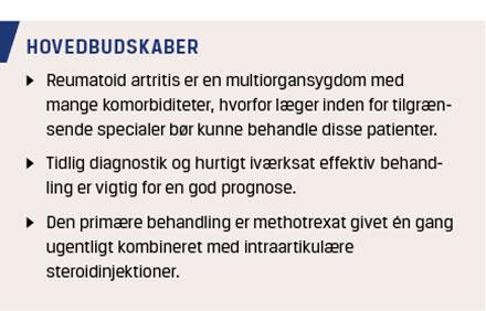 RA er en multiorgansygdom med bred specialeberøring. Tidlig diagnose og hurtig iværksættelse af effektiv behandling er afgørende for prognosen. Mistanke om RA skal opstå hos patienter, der har ledhævelser uden anden oplagt årsag. Hjørnestenen i behandlingen er MTX kombineret med intraartikulære injektioner med glukokortikoid. Behandling og monitorering skal være forankret i reumatologisk regi, men i forbindelse med komorbiditeter, infektioner og andre komplikationer er der ofte behov for vurdering og behandling i andre specialer, herunder i almen praksis.