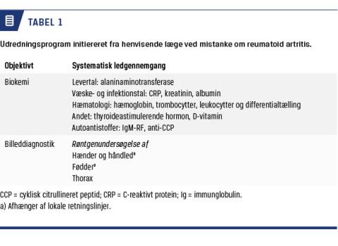 I Danmark ses der erosioner på røntgenoptagelser hos ca. 53% af patienterne med nydiagnostiseret RA [16]. Da tidlig initiering af medicinsk behandling er vigtig, skal henvisning ikke nødvendigvis afvente svar på røntgenundersøgelsen. Om den henvisende læge skal bestille røntgenbillederne, afhænger af lokale retningslinjer. Et initialt udredningsprogram anbefales igangsat fra den henvisende læge (Tabel 1).