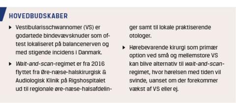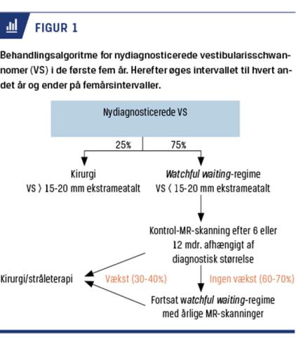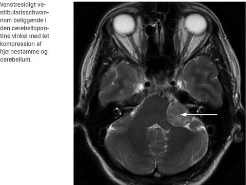 Vestibular schwannomas are benign tumours originating from the eighth cranial nerve. The incidence in Denmark is rising and is around 200 per million per year. Pure tone audiometry, discrimination score and tinnitus anamnesis determine, whether a diagnostic MRI is merited. Around one fourth of newly diagnosed patients receive surgery due to the size of the tumour, whereas the remaining three fourths go into a “wait-and-scan” regime. 30-40% of the patients in this regime experience growth and are offered either surgery or radiotherapy.