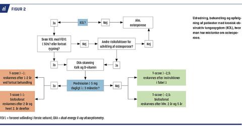 I de danske osteoporoseguidelines tilrådes det, at alle patienter med en eller flere risikofaktorer for osteoporose bør udredes ved menopausen/alder > 50 år. Blandt disse risikofaktorer er svær KOL og rygning, hvilket i praksis betyder, at udredning skal overvejes hos en stor del af patienterne med erkendt KOL (Figur 2). Patienter, der er i behandling med fast systemisk glukokortikoid, er i øget risiko for at få lavenergifrakturer og bør ligeledes udredes ved planlagt systemisk glukokortikoidbehandling med mindst 5 mg prednisolon dagligt i tre måneder. Udredningen omfatter til en start anamnese og DXA-skanning. Røntgenoptagelse af columna foretages ved mistanke om kompressionsfrakturer [8]. Da kompressionsfrakturer ofte er asymptomatiske, og patienter med KOL har øget risiko, kan tab af højde på mere end 4 cm siden 25-årsalderen være en vigtig information, da prævalensen af ryghvirvelfrakturer er påvist at stige med 2,8 gange pr. 4 cm højdetab [12].