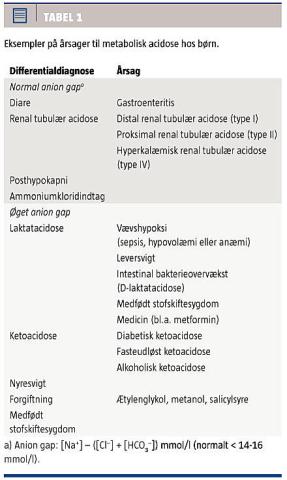 Metabolisk acidose er en hyppig tilstand på en børneafdeling. Der er mange differentialdiagnoser til metabolisk acidose hos børn, men årsagen er ofte oplagt, f.eks. gastroenteritis (pga. tab af HCO3– i afføringen) eller sepsis (pga. laktatophobning) (Tabel 1) [1]. Hvis årsagen er uklar, kan udregning af anion gap