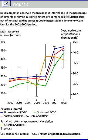 Genoplivning blev forsøgt i 2.678 tilfælde af præ-hospitalt hjertestop. Der var 2.327 tilfælde med formodet kardiel ætiologi, hvoraf 745 (32,0%) opnåede vedvarende ROSC. Den gennemsnitlige responstid var signifikant kortere hos patienter, der opnåede vedvarende ROSC (370 sekunder), end hos patienter, der ikke gjorde (394 sekunder) (p = 0,015).