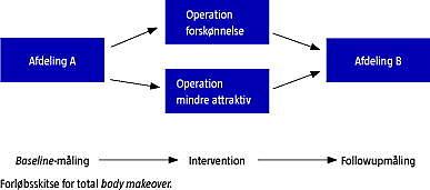 Intervention: Lægerne fra afdeling A vil blive kontaktet og tilbudt deltagelse. De vil modtage skriftlig information om studiet samt en samtykkeerklæring, der beskriver de etiske overvejelser. En total plastikkirurgisk body makeover gennemføres på alle læger, idet halvdelen opereres kønnere og halvdelen grimmere. Udvælgelsen sker ved lodtrækning. Lægerne skifter herefter arbejdsplads til afdeling B. Figur 1 .