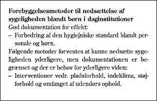 - Rindel AK, Christensen M, Kronborg D, Jensen ST. Pladsforholdenes betydning for sygeligheden i københavnske daginstitutioner. Ugeskr Læger 1997; 159: 6205-10.