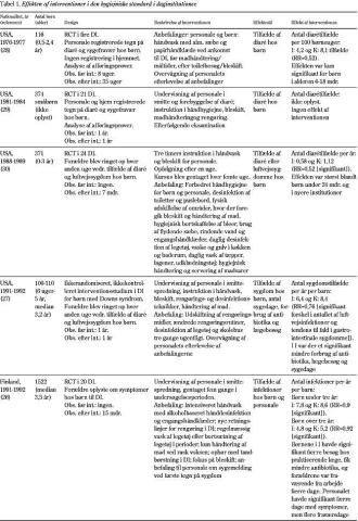 Siden begyndelsen af 1970'erne har flere nationale og internationale randomiserede, kontrollerede undersøgelser søgt at vurdere effekten af interventioner i daginstitutionernes miljø på sygeligheden blandt børnene (9, 23-30). Interventionerne har primært rettet sig mod den hygiejniske standard, men også andre komponenter som legepladsens hygiejniske forhold og indeklimaforhold er indgået i undersøgelserne (Tabel 1 ).