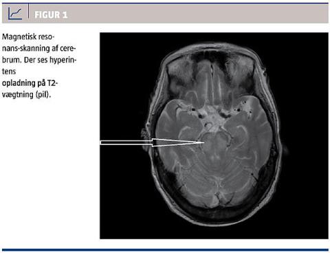 En 56-årig tidligere rask kvinde blev indbragt akut efter 4-5 dage med aftagende funktionsniveau, aktuel desorientering og respirationsbesvær. Ifølge de pårørende havde hun et moderat overforbrug af hvidvin. Ved indlæggelsen var hun orienteret i egne data, men ikke i tid og sted, hun bevægede sig normalt, men kunne ikke bidrage nærmere til anamnesen, pupillerne var normale, og der var ingen synlig facialisparese. De øvrige kranienerver blev ikke undersøgt. Patienten var dyspnøisk og hypoksisk og fik septisk shock, der udgik fra lungerne. Man påbegyndte antibiotisk behandling, og hun blev intuberet kort efter indlæggelse. Der var efterfølgende markant fald i infektionstallene, men i løbet af de næste 14 dage fik hun ny sepsis to gange, og under hele indlæggelsen var hun febril. Neurologisk var hun sløv og sovende, men havde sikker øjenkontakt og kunne i perioder nikke og ryste på hovedet på relevante tidspunkter. Efter få dage sås der et aftagende bevægemønster, og hun kunne ikke efterkomme opfordringer eller give verbal respons.