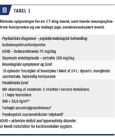 En 17-årig mand var diagnosticeret med ADHD, autismespektrumforstyrrelse og depressiv enkeltepisode. Han var velbehandlet med lisdexamfetamin 70 mg/dag og sertralin 100 mg/dag (Tabel 1). Han blev indlagt i neurologisk regi pga. 16 episoder over et døgn med talebesvær og slaphed af højre arm. Anfaldene var forudgået af kortvarig, moderat hovedpine. Under anfaldene sås dysartri, manglende spontantale og højresidig hemiparese. Han var neurologisk intakt mellem anfaldene. Der var ingen familiær disposition til kardiovaskulær lidelse, og patienten var ikkeryger, havde intet alkoholoverforbrug og ingen misbrugsproblematik. Han var somatisk rask fraset overvægt (BMI = 33,6 kg/m2) og en tidligere episode med hypertension, hvor han var blevet kontrolleret i medicinsk regi.