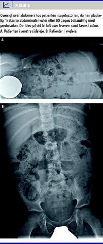 Efter 13 dages prednisolonbehandling blev han genindlagt med mavesmerter og feber. Han var bleg, svedende og perifert kold. Abdomen var opdrevet og uømt med sparsomme tarmlyde, og leveren var palpabel to fingerbredder under kurvaturen. Laboratorieværdier: leukocytkoncentrationen var 38 × 10 9 /l, koncentrationen af C-reaktivt protein var inden for normale værdier, og urinstiksprøver viste normale forhold. En røntgenoversigt over abdomen (OOA) viste svær ventrikelretention, dilaterede tyndtarmsslynger med væskespejl samt store mængder fæces i colon. Ved UL af abdomen blev der påvist ascites og en let forstørret lever. Ventrikelaspirat var ublodigt. Behandling med trestofsantibiotika givet intravenøst og antiobstipationsmedikamina: klysma (docusat og sorbitol) samt macrogol blev initieret. Bloddyrkninger viste intet abnormt.