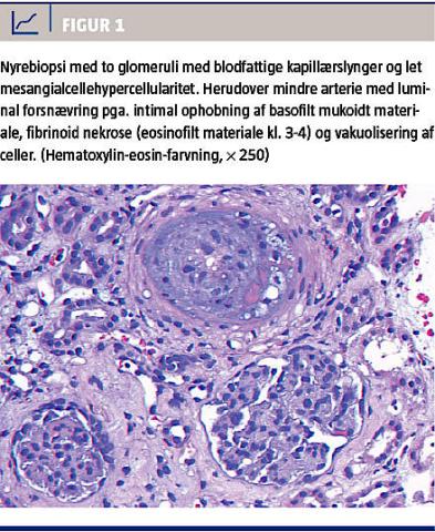 Som følge af stigende S-kreatinin i løbet af få dage til næsten 1.000 mikromol/l blev patienten sat i hæmodialysebehandling. En nyrebiopsi viste svære forandringer i arteriolerne med luminal forsnævring pga. intimaproliferation og basofili samt fibrinoid nekrose (Figur 1).