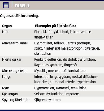 Systemisk sklerodermi er en systemisk bindevævssygdom i huden og andre organer [3, 4]. Der er ca. 1.000 patienter med sygdommen i Danmark, 80% er kvinder. Debutalderen er 30-50 år. Diagnosen kan kun stilles klinisk ved inspektion og palpation af huden, som findes fortykket med nedsat forskydelighed mod underlaget og nedsat evne til at kunne foldes. Sygdommen kan involvere andre organer (Tabel 1) [4]. 90% af patienterne har kerneantistoffer i serum (positiv ANA), hyppigst centromerantistof (35%), SCL-70-antistof (20%) eller ribonukleinsyre (RNA)-polymeraseantistof (25%) [3, 4]. Patienter med SRC har SCL-70-antistof eller RNA-polymeraseantistof i serum [1]. Patienten i sygehistorien havde dog ingen kerneantistoffer.