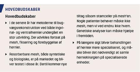 Der er en rivende udvikling i herniekirurgien i forhold til både mesh-materialer, -placering, -fiksering og i det hele taget brugen af mesh. Derudover vil vi i de kommende år se en større grad af individualiseret behandling, når der kommer resultater om genernes påvirkning af risikoen for dels at få hernier, dels at få recidiv. Det må antages at betyde, at specialisering af bugvægskirurgien også kan være relevant i Danmark.