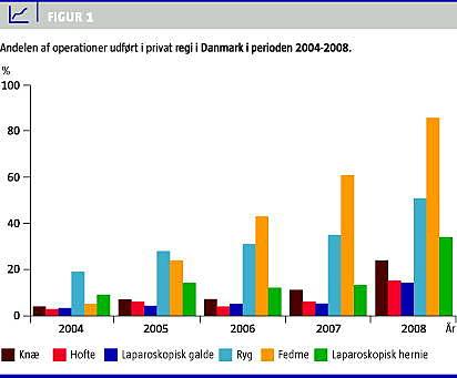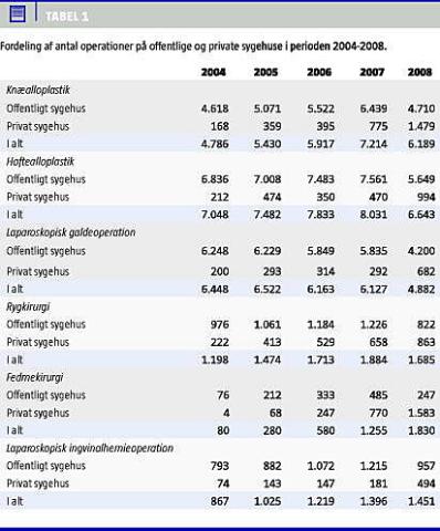 Materiale og metoder: Operationsaktiviteten i offentligt og privat regi inden for knæ- og hoftealloplastik, laparoskopisk galde- og lyskebrokkirurgi, ryg- og fedmekirurgi i Danmark i femårsperioden 2004-2008 beskrives ud fra Landspatientregisterdata.