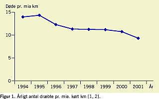 Udviklingen i antallet af trafikdræbte pr. kørt mia. km i Danmark i 1994-2001 vises i Figur 1. Det ses, at antallet af dræbte var signifikant lavere i periodens sidste fire år. I 2001 blev der kørt 18% flere km end i 1993, mens antallet af dræbte faldt med 27% fra 546 til 431 [1, 2].