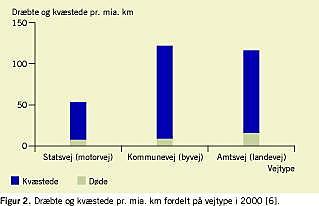 I Figur 2 vises antallet af dræbte og kvæstede pr. mia. km på motorveje, landeveje og kommuneveje. Pr. mia. km var der 7,9 trafikdræbte på statsveje, 9,0 på kommuneveje og 15,9 på amtsveje. Antallet af kvæstede var på over 100 pr. mia. km på amts- og kommuneveje, mens der var under 50 kvæstede på statsveje [1 ]. Uheld på stats- og amtsveje var således de alvorligste, da de resulterede i flest dræbte pr. uheld.
