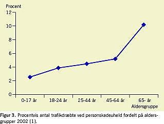 Figur 3 viser, at i 10% af uheldene med personskade i 2002 skete der dødsfald blandt ældre over 65 år, mens dødeligheden for andre aldersgrupper var på 3-5%. Ældre over 65 år havde i perioden 1993-2002 højsignifikant flere dødsfald ved uheld med personskade end de øvrige aldersgrupper havde [1]. Som det ses af Figur 4 , var de fleste dræbte i trafikken unge og ældre.