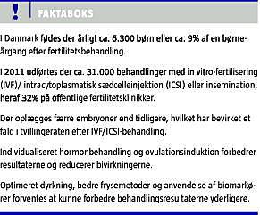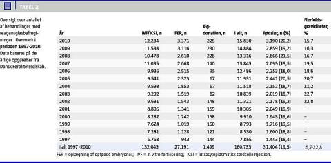 Den første fødsel af et barn efter in vitro-fertilisering (IVF) markerede begyndelsen til en ny æra for behandling af ufrivillig barnløshed [1]. I en dansk lærebog for gynækologi fra 1982 anføres om IVF, at »Alene det meget store forbrug af ressourcer taler for, at metoden næppe vil vinde større anvendelse ...« [2]. Som det fremgår af nedenstående, udførtes der i Danmark i perioden 1997-2010 160.733 behandlinger, så denne forudsigelse holdt ikke.