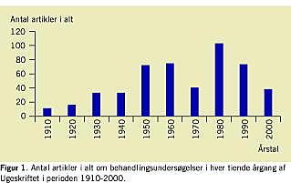 Resultater: I løbet af perioden sås et stigende antal forfattere pr. artikel uden samtidig stigning i patientantallet i den enkelte undersøgelse. Forsøg med en kontrolgruppe forekom med stigende hyppighed, men udgjorde dog aldrig mere end halvdelen af de publicerede undersøgelser. Det første randomiserede forsøg sås i 1970. Antallet af behandlingsundersøgelser publiceret i Ugeskriftet toppede i 1980 for derefter at falde. Indtrykkene fra gennemgangen af artiklerne beskrives.
