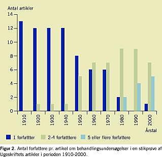 I Figur 2 ses, at stort set alle artikler fra 1910 til 1940 kun havde én forfatter. Herefter optræder artikler me d 2-4 forfattere og fra 1980 artikler med over fem forfattere. Fra 1990 sås artikler med ti forfattere, mens der til gengæld i 2000 kun var en enkelt med én forfatter. Stigningen i forfatterantal var statistisk signifikant (p(ensidet) < 0,0001, Jonckheere-Terpstra-test) [10].