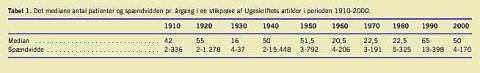 I Tabel 1 vises det mediane antal patienter og spændvidden for hver årgang. Der fandtes ingen tendens til et stigende patientantal (p(ensidet) = 0,18 Jonckheere-Terpstra-test), hel- ler ikke når de to artikler fra 1920 med meget store patientgrupper fraregnedes. I nogle artikler spredt over perioden frem til 1970 var der ingen oplysning om patientmaterialets størrelse.