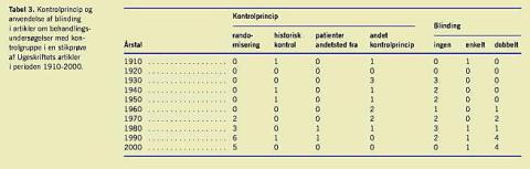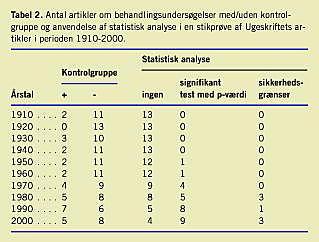 I Tabel 2 ses, at antallet af undersøgelser med kontrolgruppe var ringe (ca. to pr. årgang) indtil 1970. Herefter steg antallet (p < 0,01, χ2 -test for trend), men undersøgelser uden kontrolgruppe var dog fortsat det almindeligste. I tabellen vises også fravær af statistisk analyse i artiklerne til og med 1940. I de følgende to årgange fandtes kun to artikler med statistisk analyse af resultaterne, men forfatterne til den ene nævnte blot, at resultatet var nonsignifikant uden at angive en p-værdi, mens de i den anden beregnede en ukonventionel p-værdi. Fra 1970 steg forekomsten af statistisk analyse frem til 2000, hvor ni ud af 13 forsøg var underkastet en sådan. Kun ganske få artikler frembød udregning af sikkerhedsgrænser på helbredelsesforskellen.
