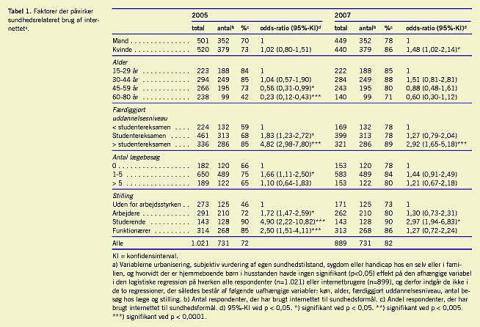 Summary Developments in the population's use of the internet for health-related purposes Ugeskr Læger 2009;171(12):1007-1011 Introduction: We wish to study the development in the Danish population's use of the internet for health-related purposes. What has changed from 2005 to 2007? Who is the typical user and what exactly is the internet used for? Material and methods: As part of a larger EU-funded survey, 1,000 randomly selected Danes between 15-80 years of age completed a questionnaire in the fall 2005. The same questions were put to 1.021 Danes in the spring of 2007 to study any trends. Results: A total of 72% of the Danes use the internet when searching for information on health. This constitutes an increase of 20% from 2005. Personal contact with the general practitioner (GP) is still the most important source of health and illness information, but more than 50% also consider the internet to be an important or very important source of health information. Women are still more active than men when searching for health information. A total of 20% of the Danes have consulted their own GP online, which is a 161% increase. Also, it has become more important for the Danes when choosing a GP that he or she offers eServices. Conclusion: The Danes' use of the internet for health information purposes has increased. And when the Danes seek health and illness information, it is primarily used to decide if the GP should be consulted. The GP remains the primary source of information and the Danes consult with their GP more and more frequently via the internet.