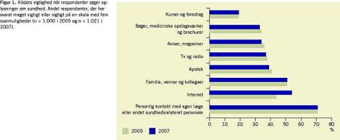 Figur 1 viser, at kontakten med egen læge eller andet sundhedsfagligt personale fortsat er den vigtigste kilde til information om sundhed og sygdom. Over 50% af respondenterne svarede i 2007-undersøgelsen, at de anser internettet som en vigtig eller meget vigtig kilde til oplysninger om sundhed. Internettet er den eneste informationskilde, hvor der er sket en signifikant stigning i respondenternes vurdering af kildens betydning fra 2005 til 2007.