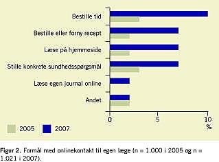 Der er en signifikant stigning i andelen, der har svaret, at de har opsøgt egen læge online. I 2007 svarede 20% (n = 205), at de havde opsøgt egen læge eller andet sundhedsfagligt personale via internettet. I 2005 var det tilsvarende kun 8% (n = 77).