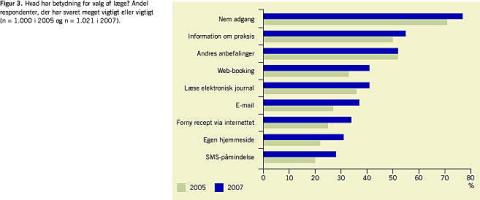 Resultaterne af undersøgelsen viser, at 20% af danskerne allerede har været i kontakt med deres læge via internettet, hvilket er næsten tre gange så mange som i 2005. Denne stigende tendens i brugen af e-ydelser hos egen læge afspejles også i opgørelserne over antallet af faktiske e-konsultationer. Fra 2006 til 2007 er antallet af elektroniske ydelser i praksis vokset med over 75% [16]. Det er rimeligt at antage, at denne anvendelse afspejler tilbuddet af e-health-tjenester pr. e-mail, som er den enkleste kontaktform, ligesom det er konstateret i USA [9].