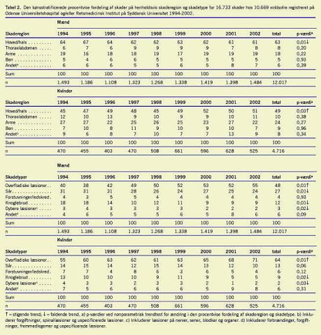 I perioden 1994-2002 inkluderedes i alt 10.669 voldsofre med samlet 16.733 skader svarende til 1,6 skade pr. voldsofre. Tabel 2 viser den procentvise fordeling og udvikling i skadede kropsregioner og skadetyper for mænd og kvinder 1994-2002. For begge køn forekom størstedelen af skaderne på hoved/hals (63% og 49%) og på arme (18% og 24%). Den procentvise andel skader på hoved/hals faldt signifikant blandt mænd (nonparametrisk trendtest, p = 0,01) og steg signifikant blandt kvinder (nonparametrisk trendtest, p = 0,03). For både mænd og kvinder var overfladiske læsioner (abrasio eller kontusion) og sår (penetrerende alle hudens lag) den hyppigste læsionstype (48% og 64% vs. 27% og 13%). Henholdsvis 3% og 2% af læsionerne hos mænd og kvinder var dybere læsioner (læsioner af organer nerver, sener eller blodkar). Blandt både mænd og kvinder steg andelen af overfladiske læsioner (nonparametrisk trendtest, p = 0,01). Blandt mænd faldt andelen af sår (nonparametrisk trendtest, p = 0,01). Den procentvise andel af knoglebrud og dybere skader faldt signifikant for mænd (nonparametrisk trendtest, p = 0,01 og p = 0,02) og kvinder (nonparametrisk trendtest, p = 0,02 og p = 0,03) i perioden 1994-2002.