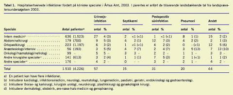I landsprævalensundersøgelsen i Århus Amt 2003 medvirkede i alt 1.510 patienter. Antallet af patienter med en CAI og en HAI var henholdsvis 276 (18%) og 151 (10%). Antallet af patienter med en eller flere HAI spændte fra 7% hos patienter i intern medicin til 29% hos intensivpatienter. Der blev i alt registreret 167 tilfælde af HAI. Antallet af infektioner inden for de hyppigste kategorier af HAI (Tabel 1 ) udgjorde 123 af de 167 tilfælde og fordelte sig som følger: urinvejsinfektioner 57 (34%), postoperative sårinfektioner 31 (19%), pneumonier 20 (12%) og septikæmier 15 (9%). De resterende tilfælde af HAI omfattede f.eks. hudinfektioner, proteseinfektioner, meningitis, osteomyelitis og tegn på systemisk infektion uden erkendt focus. De landsdækkende tal fra landsprævalensundersøgelsen 2003 [1] er indsat i Tabel 1 til sammenligning.