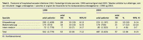 Tabel 2 viser en sammenligning af antallet af HAI i de specialer, som deltog i landsprævalensundersøgelserne i både 1999 og 2003. Mest markant er øgningen af HAI i det abdominalkirurgiske speciale og reduktionen af HAI i det medicinske speciale (udvalgte afdelinger). De landsdækkende tal fra landsprævalensundersøgelserne 1999 [6] og 2003 [1] er indsat i Tabel 2 til sammenligning.