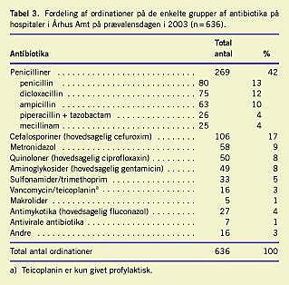 Tabel 3 viser fordeling af ordinationer af de enkelte grupper af antibiotika. Den hyppigst anvendte gruppe af antibiotika var penicilliner med 42% af det samlede antal af ordinationer.