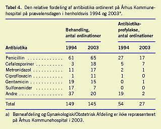 Andelen af patienter i antibiotikabehandling på Århus Kommunehospital er steget signifikant fra 152 ud af 689 (22%) i 1994 til 125 ud af 349 (36%) i 2003, p < 0,05. Disse tal understøttes af løbende tilsendte data vedrørende antibiotikaforbruget fra Apoteket på Århus Universitetshospital. Disse data viser, at forbruget af antibiotika på Århus Universitetshospital (alle afdelinger) fra 1993 til 2002 blev øget med 57%. I denne periode blev forbruget af cefalosporiner og quinoloner (ciprofloxacin) mere end fordoblet, mens forbruget af ampicillin og sulfonamider faldt. Ovennævnte data fra apoteket viser desuden, at på intensivafdelingerne er forøgelsen af forbruget alene af quinoloner (ciprofloxacin) tidoblet i perioden 1993-2002. Betydelige ændringer i forbrug af antibiotika, enten i total mængde eller i relativ fordeling af præparater, kan ændre sammensætningen af hospitalsmiljøets mikroorganismer både med hensyn til antibiotikaresistens og med hensyn til relativ fordeling af arter. Dette kan, hvad angår art og antal, i sig selv lede til ændrede forekomster af sygehuserhvervede infektioner. Der er dog i perioden mellem punktprævalensundersøgelserne i 1994 og 2003 kun sket beskedne ændringer i resistensforekomst og speciesfordeling for f.eks. bakteriæmier på Århussygehusene, fraset en tidobling i forekomsten af candidæmier på intensivafdelingerne og en generel stigning i forekomsten af multiresistente Staphylococcus aureus (MRSA) [13].
