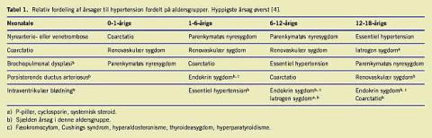 Generelt gælder, at jo yngre barnet er, og des kraftigere forhøjet BT man finder, des mere sandsynlig er en sekundær årsag [1, 3, 4]. Hypertension hos børn må derfor udredes nøje under hensyntagen til hyppigheden af de udløsende faktorer og deres fordeling i forskellige aldersgrupper (Tabel 1 ).