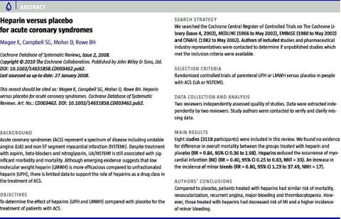 <li>Magee KD, Campbell SG, Moher D et al. Heparin versus placebo for acute coronary syndromes. Cochrane Database Syst Rev 2008;(2):CD003462.</li>