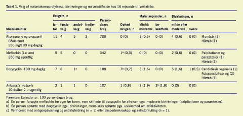 Seksten rejsende blev interviewet efter en tremåneders studierejse i Mali, Burkina Faso og Ghana. Alle oplyste, at de tog malariaprofylakse på hele turen og i det foreskrevne interval efter hjemkomst, kun få doser blev sprunget over. Ved rejsens start tog fire atovaquone og proguanil (Malarone), fire tog mefloquin (Lariam), syv tog doxycyclin, og en tog Artemisiadråber. Ti personer oplevede symptomer, som de tilskrev bivirkninger ved malariamedicinen (Tabel 1 ). En forsøgte at tage mefloquin inden afrejsen, men skiftede til doxycyclin pga. moderate bivirkninger. I de første 40 dage af rejsen fik tre konstateret malaria på en lokal klinik, alle havde anvendt doxycyclin. Desuden havde en fået svamp i skeden under doxycyclinprofylakse. Herefter opstod der så stor usikkerhed om brugen af doxycyclin, at alle besluttede sig til at ophøre med at indtage stoffet. Seks skiftede til atovaquon og proguanil , som foreslået af en rejsemedicinsk klinik i Danmark, mens den sidste valgte Artemisiadråber på opfordring af en anden deltager.