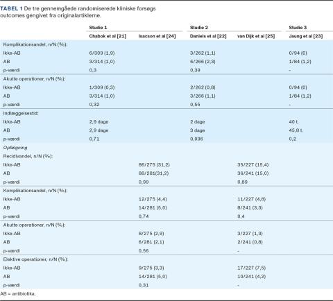 Der er for nuværende publiceret tre randomiserede kliniske forsøg (RCT), hvor man i alle har randomiseret patienter med akut ukompliceret divertikulitis til konservativ (ikke-AB) eller AB-behandling. For to af studierne har man udgivet data om langtidsopfølgning. I de følgende afsnit bliver studierne gennemgået, og i Tabel 1 opsummeres resultaterne.