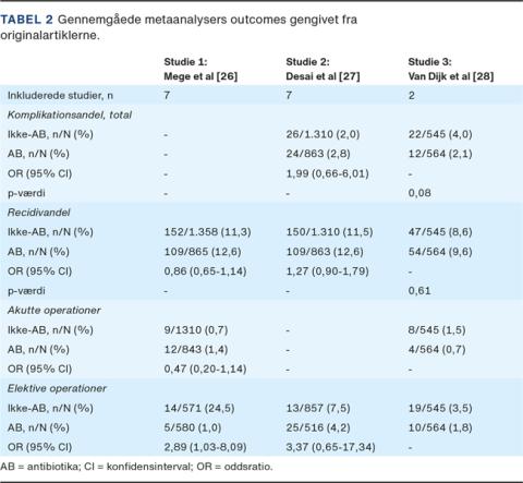Der er også publiceret metaanalyser, hvor både RCT’er og observationelle studier er inkluderet, resultaterne er opsummeret i Tabel 2. Mege et al [26] inkluderede syv studier (2.321 patienter), og metaanalysen viste, at der ikke var forskel på recidivandel eller antal akutte og elektive operationer, når patienter med CT-verificeret akut ukompliceret divertikulitis blev behandlet med eller uden AB. I en anden metanalyse af Desai et al [27] inkluderede man næsten samme studier som Mege et al [26]. Desai et al fandt ligeledes ingen signifikant forskel på outcomes ved ikke-AB- og AB-behandling af akut ukompliceret divertikulitis for hverken recidivandel, komplikationsandel eller antal colonresektioner.