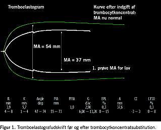 Det var i denne akutte situation ikke realistisk at måle traditionelle koagulationstal, da responstiden er ca. en time. Da man på afdelingen på dette tidspunkt havde lånt en tromboelastograf (TEG, Haemoscope), blev der udført et tromboelastogram til vurderingen af koagulationsstatus før behandling med eptacog alfa. Tromboelastogrammet viste nedsat maksimal amplitude (MA). Nedsat MA ses ved kvantitativ eller kvalitativ trombocytdysfunktion, kvantitativ eller kvalitativ fibrinogendysfunktion eller begge dele. Da patienten var substitueret med FFP, skønnede vi, at man kunne se bort fra fibrindysfunktion, og at patienten havde trombocytopeni/ trombocytdysfunktion (Figur 1). Der blev derfor indgivet yderligere 600 ml trombocytkoncentrat, hvorefter blødningen aftog, så det neurokirugiske indgreb kunne udføres. Der var nu hæmostase i den cerebrale læsion, men patienten var hypovolæm, og der blev givet yderligere SAGM og FFP. Der var ingen indikation for at bruge eptacog alfa. Den neurokirurgiske operation afsluttedes efter seks timer og 20 minutter, hvorefter patienten overgik til en kæbekirurgisk operation, der blev afsluttet syv timer senere. Det samlede blodtab blev på dette tidspunkt skønnet til at være på over 11.000 ml, og den samlede substitution blev SAGM 6.600 ml, FFP 3.600 ml og trombocytkoncentrat 900 ml. Der blev umiddelbart post-operativt målt normale værdier for faktor II + VII + X og faktor I + II + V + VIII + XII. Patienten blev udskrevet fra neurokirurgisk afdeling til hjemsygehus efter 14 dage.