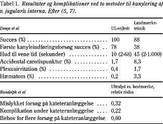 UL giver en højere succesrate og et mindre tidsforbrug. UL reducerer antallet af forsøg på kanylering og nedsætter den akutte komplikationsfrekvens (5, 6). En metaanalyse (7) baseret på otte randomiserede og kontrollerede undersøgelser, hvori UL blev sammenlignet med standardlandmærketeknik, har bekræftet fordelene ved at brug UL (Tabel 1). Pneumo- og hæmothorax er sjældne komplikationer (<0,5%) med landmærketeknik (1), og der er ikke rapporteret om disse komplikationer med UL-teknik.